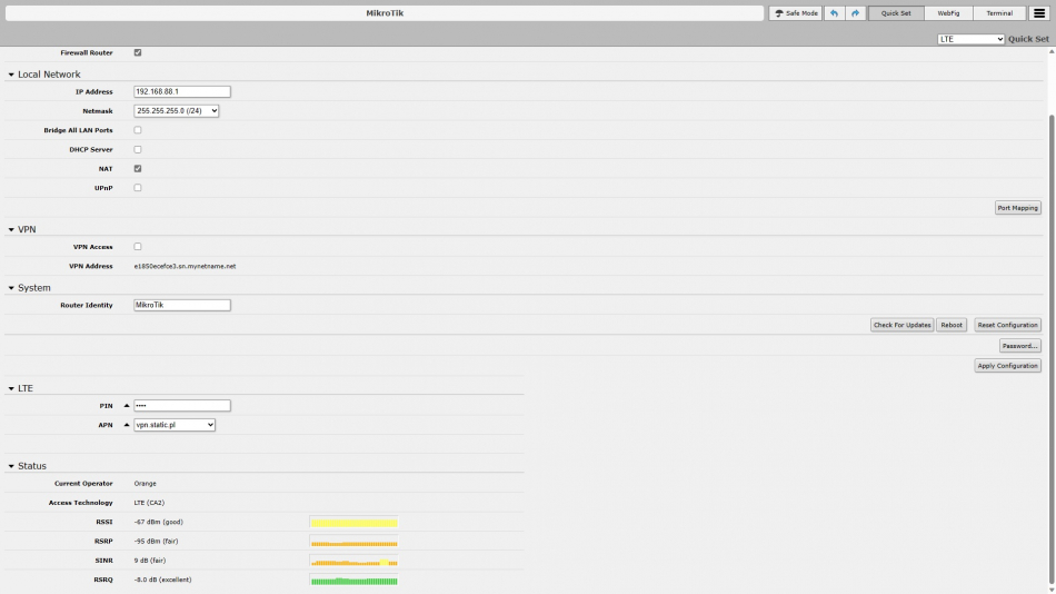 Jakiś czas temu w głównym magazynie firm, z którymi współpracuję, zrobiłem duże roszady w sprzęcie sieciowym. Dotychczas działający router 4G LTE TP-Link Archer MR600 zamieniłem na tandem Supermicro SuperServer SYS-E302-9A z zainstalowanym systemem pfsense oraz MikroTik wAP ac LTE6 kit. Pfsense miałem już wdrożone u siebie w serwerowni więc na magazynie chciałem mieć takie samo oprogramowanie, aby ujednolicić zapory sieciowe do jednego rozwiązania. Urządzenie MikroTik`a wybrałem dlatego, ponieważ chcę bardziej wgryzać się w oprogramowanie tego producenta (próg wejścia jest wyższy w porównaniu do konkurentów) oraz zależało mi na urządzeniu, które będzie działało jako "pośrednik" między mną a operatorem GSM (w tym wypadku Orange). Ów sprzęt ma również dodatkową zaletę w postaci możliwości zasilania PoE.