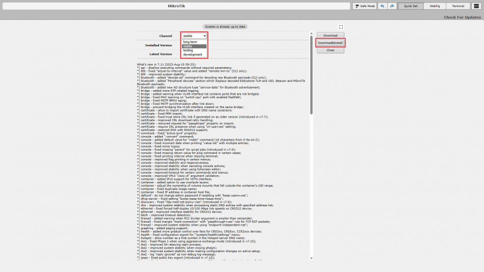 Do wyboru mamy cztery kanały: long term, stable, testing i development. Dwa pierwsze przeznaczone są do urządzeń działających produkcyjnie, a dwa ostatnie do zabawy. 😋 Każdy kanał wyświetla szczegółową listę zmian jakie wprowadzono w danej wersji. Wybieram kanał stabilny i klikam przycisk Download&Install i czekam aż urządzenie zrobi swoje.