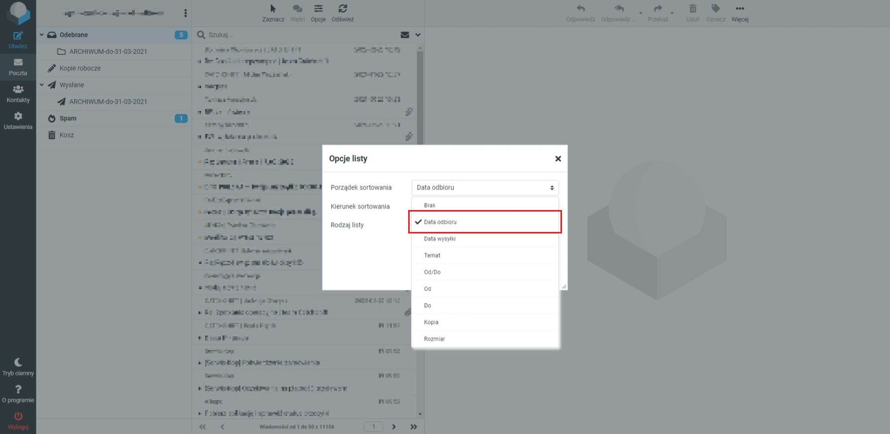 Opcje, na ekranie pojawi się okno Opcje listy, w którym przechodzę do Porządek sortowania i z listy wybieram Data odbioru.