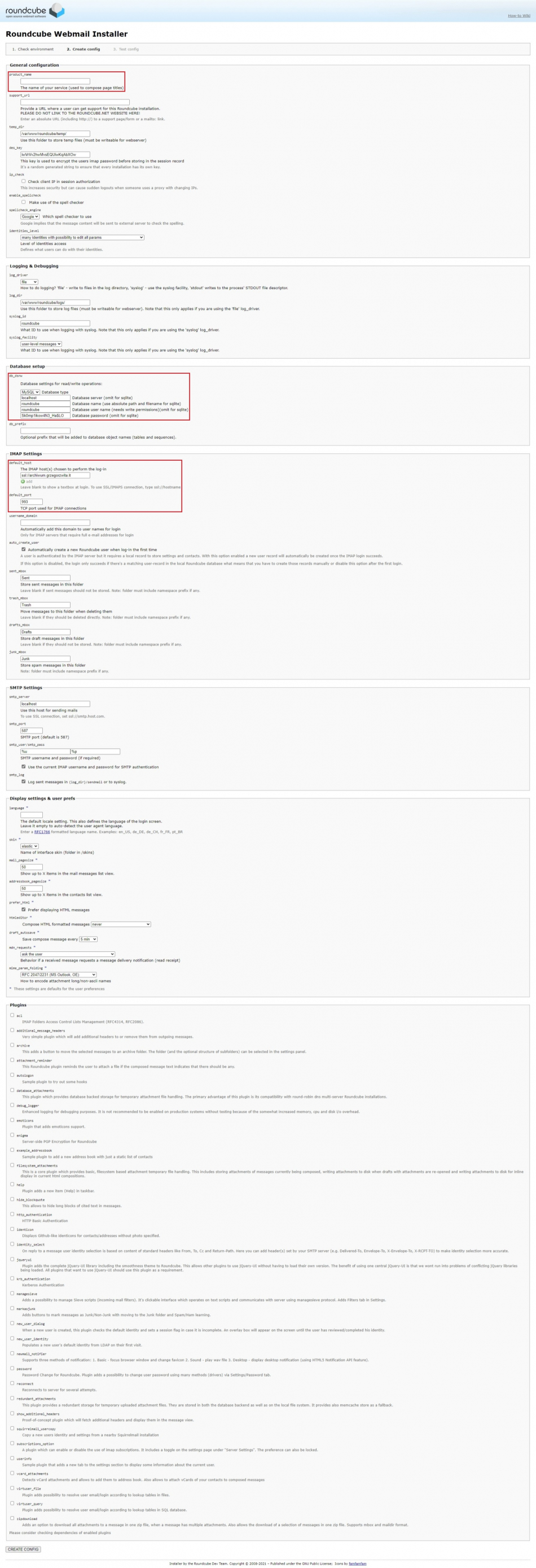 NEXT i przechodzę do drugiego kroku, gdzie usuwam nazwę produktu z pola product_name (jeśli chcesz, to możesz wpisać swoją nazwę), wprowadzam dane dostępowe do bazy danych, w sekcji IMAP Settings zmieniam wartość pola default_host z localhost na SSL://archiwum.grzegorzwita.it oraz default_port z 143 na 993. Resztę opcji zostawiam w ich wartoścach domyślnych i na koniec klikam przycisk CREATE CONFIG.