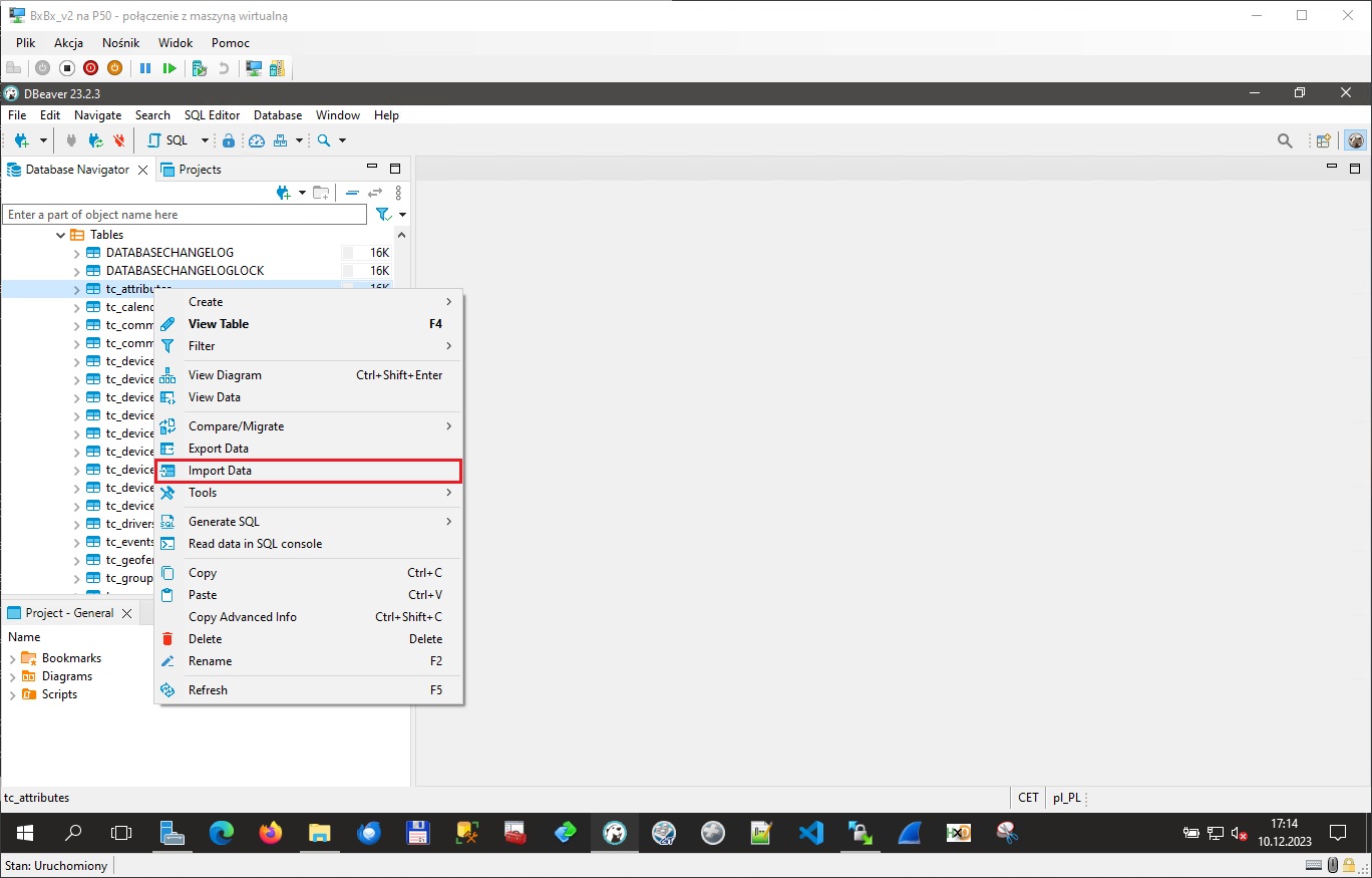 W celu rozpoczęcia importu danych przechodzę na serwer MySQL, zaznaczam tabelę, klikam PPM i z menu wybieram Import Data.