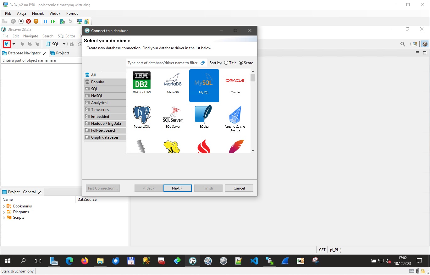 Connect to a database wybieram MySQL, a następnie klikam przycisk Next >.