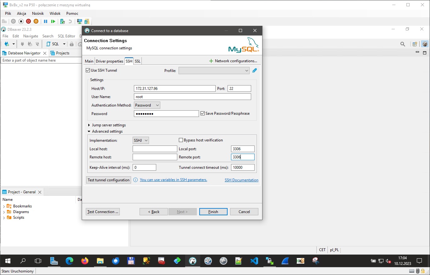 Przechodzę na zakładkę SSH i ustawiam połączenie SSH, a opcjach zaawansowanych lokalny oraz zdalny port ustawiam na domyslny port MySQL czyli 3306.