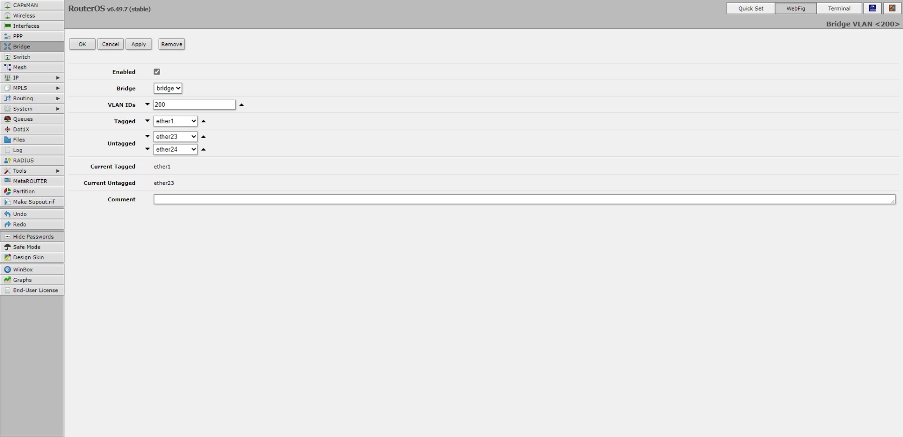 Bridge ➔ Bridge ➔ bridge ➔ VLAN Filtering ☑ ➔ Apply i OK